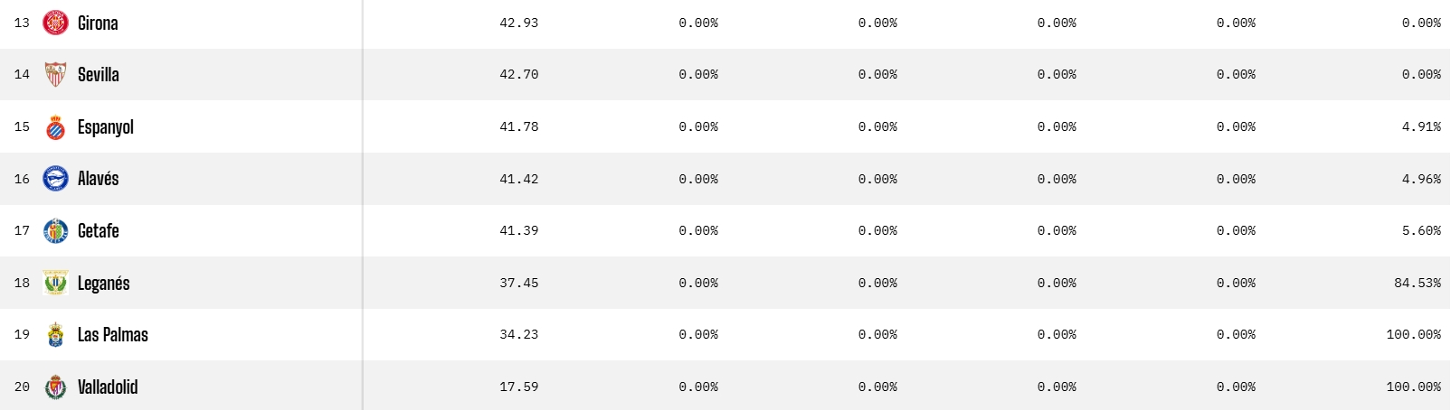 Cuando la IA simula las dos jornadas restantes, le salen los siguientes números totales: el Leganés acabaría con 37,45 puntos, el Getafe con 41,39, el Alavés con 41,42 y el Espanyol, ligeramente por encima, con 41,78. Pequeñas diferencias que pueden marcar el destino de toda una temporada.