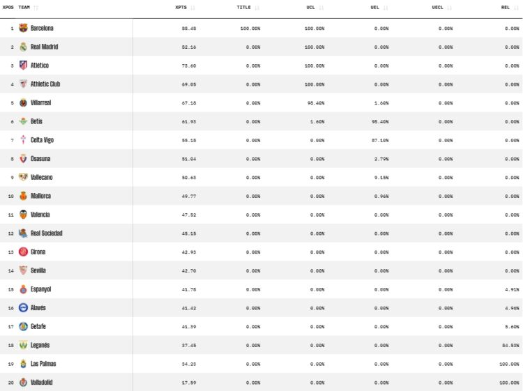 Lo curioso es ver cómo ha ido cambiando estos días esa cifra en el caso perico. Antes de esta jornada, el superordenador le daba un 3,9% de opciones de bajar. Antes del derbi contra el Barça, era incluso más optimista: 3,76%. La derrota en Cornellà ante el Barça no ayudó a mejorar la proyección, pero al menos no la empeoró de forma grave.