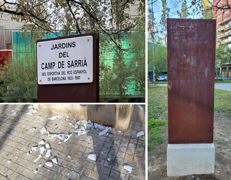 La placa que el Ayuntamiento de Barcelona colocó discretamente hace unas semanas ha sido completamente destruida por unos vándalos. La placa de mármol, con la configuración habitual utilizada en la nomenclatura de las calles de la ciudad, anunciaba el nombre del espacio público, conocido como Jardins del camp de Sarrià. Debajo del nombre, figuraba la leyenda “seu esportiva del RCD Espanyol de Barcelona 1923-1997”. Esto ha bastado para que los vándalos se hayan encargado de reducirla a pedazos, como puede verse en la fotografía que encabeza el texto, amén de dejar escrito con spray el mensaje “Pericos fora de BCN”, que la brigada municipal se ha aprestado a retirar, aunque todavía puede leerse.