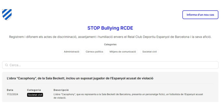 Esta web, a la que se accede desde la url https://bullyingrcde.softr.app/, dispone de un formulario para registrar y difundir los actos de acoso y humillación que se produzcan, conformando un histórico de casos clasificados por su procedencia: administración, cargos políticos, administración y medios de comunicación. En suma, una iniciativa interesante que además permite contribuir en este esfuerzo para hacer visibles todos los casos de los cuales son víctima el Espanyol y sus gentes.