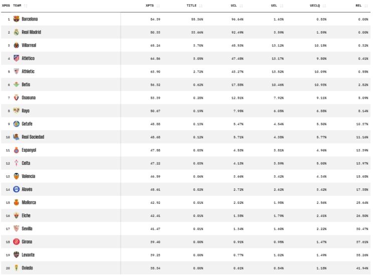 En la pelea por la Champions, la proyección coloca al Villarreal con un 48,53% de opciones y al Atlético con un 47,48%, mientras que el Athletic se asienta con fuerza con un 43,27% y el Betis asoma con un 17,88% que refleja que, pese a estar en el grupo perseguidor, no parte con la misma solidez que los tres anteriores. Osasuna y Rayo se mantienen como alternativas, aunque en porcentajes menores, y la Real Sociedad cierra esa segunda fila europea en torno al 6%.