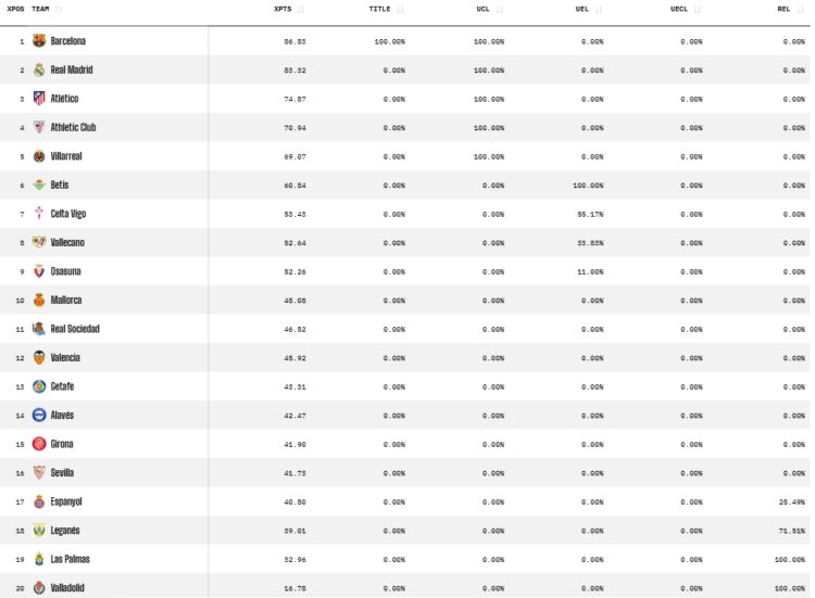 Antes de disputarse la penúltima jornada, los modelos de Opta situaban al Espanyol con tan solo un 4,91% de probabilidades de descenso, frente al 84,53% que asumía el Leganés. La victoria de los madrileños y la derrota del conjunto blanquiazul en El Sadar han trastocado por completo las estimaciones. Ahora, con un solo encuentro por disputarse, el Espanyol presenta un 28,49% de opciones de perder la categoría, mientras que el Leganés mantiene un 71,51%.