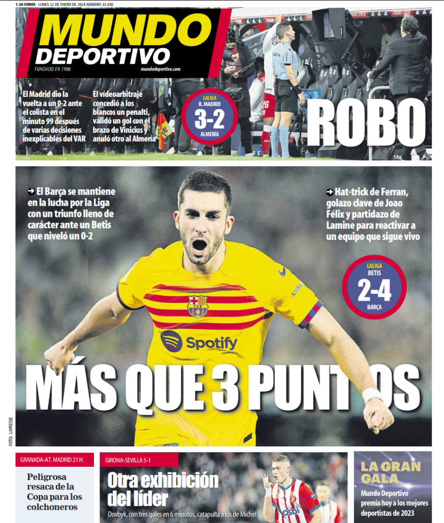 Días como hoy sirven para confirmar dos hechos: el maltrato o al menos, trato discriminatorio del global de la prensa deportiva catalana hacia el RCD Espanyol, y la necesidad de trabajar por unos medios blanquiazules que no se limiten a llegar únicamente a la afición perica sino que lo hagan a una órbita más extensa, que tengan un mayor alcance y repercusión. Y es que sólo hay que hacen un simple ejercicio de hemeroteca para comprobar el trato mediático tan diferente que recibió en la prensa catalana en su día el escándalo en una de las jugadas más polémica de toda la pasada temporada, cuando el asistente VAR omitió imágenes en el gol fantasma concedido al Atlético de Madrid en su partido ante el Espanyol, algo que ha llevado a la entidad blanquiazul a emprender medidas legales para “defender los intereses del club” tras el fallo de la justicia madrileña que señala la omisión de imágenes durante el encuentro, una más en la serie de situaciones incomprensibles que influyeron decisivamente en un descenso de categoría por el que a los espanyolistas se les privó de poder luchar por evitar en el terreno de juego en la última jornada disputada contra la UD Almería, y el bombo que se le está dando a lo sucedido este domingo en el Santiago Bernabéu entre el Real Madrid y precisamente el cuadro indálico. Evidentemente, queda claro que las polémicas arbitrales merecen titulares si el afectado es el FC Barcelona o en su defecto el Girona FC, y el beneficiado es su directo rival, el Real Madrid. Y si no, sirva de ejemplo la diferencia en las portadas de los tres periódicos que se editan aquí: