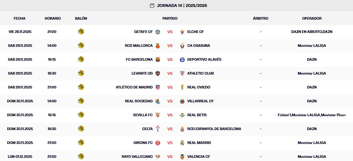 Esta jornada 14 de LaLiga EA Sports se reparte entre el 29 de noviembre y el 2 de diciembre con un cartel lleno de tensión, reencuentros y mucho en juego tanto por arriba como por abajo. Mientras el Espanyol visita Balaídos con la opción de afianzarse en zona europea ante un Celta irregular, el domingo también trae un derbi sevillano eléctrico entre Betis y Sevilla, y un Girona – Real Madrid donde los blancos no pueden fallar. Antes, el viernes arranca la acción en el Coliseum con un Getafe – Elche de aspirantes, y el sábado se reparten urgencias: Mallorca y Osasuna pelean por aire, el Barça recibe al Alavés, Levante y Athletic se lamen heridas en el Ciutat, y el Atleti busca no tropezar ante el colista Oviedo. El lunes, Vallecas cerrará la jornada con un Rayo – Valencia de trincheras, con ambos equipos marcados por su momento anímico.