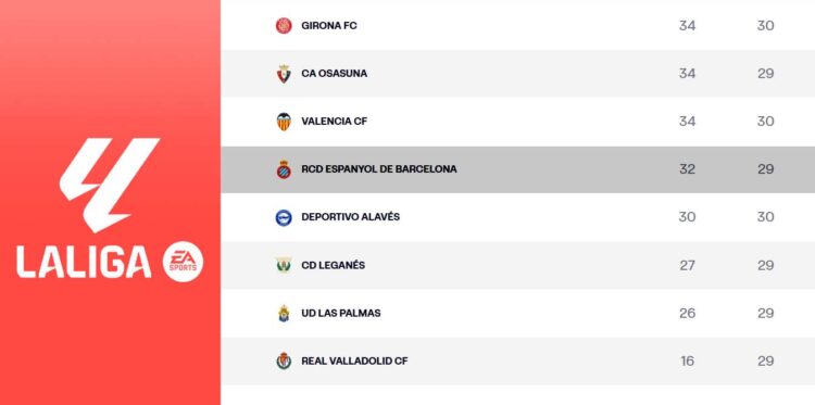La fecha se entrenaba como decimos con el Rayo Vallecano – Espanyol, que finalizaba con un merecido triunfo blanquiazul (0-4) que ponía a los de Manolo González provisionalmente 5 puntos sobre el descenso.