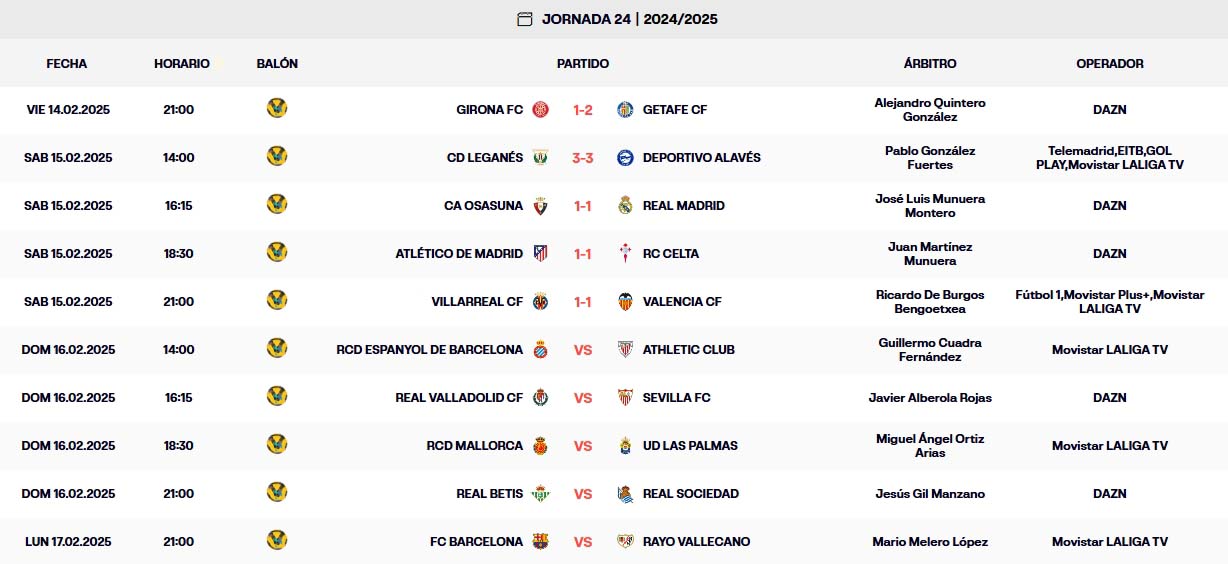 Este fin de semana se disputa la jornada 24 de LaLiga EA Sports. La misma daba comienzo el viernes 14 con el duelo en Montilivi entre el Girona y el Getafe (1-2) como preludio a un sábado con otros cuatro encuentros: Leganés – Alavés (3-3), Osasuna – Real Madrid (1-1), Atlético Madrid – Celta (1-1) y el derbi entre el Villarreal y el Valencia (1-1). Con estos resultados, el Espanyol vuelve provisionalmente a zona de descenso: los pericos y el Valencia quedan empatados a puntos -llevan los mismos 23 que la UDLP– con la misma diferencia de goles (-13), pero los ché pasan delante al haber anotado tres tantos más que los pericos.