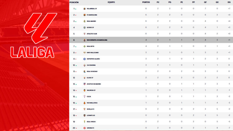 La jornada 2 de LaLiga EA Sports 25-26 ya ha finalizado, dejándonos al Espanyol sexto con cuatro puntos En la parte alta hay un grupo que suma los partidos por victorias, integrado por Villarreal, Barcelona, Real Madrid, Getafe y Athletic Club. Por abajo, los tres puestos de descenso son para Levante, Oviedo y Girona con 0 puntos, los mismos que el Sevilla.
