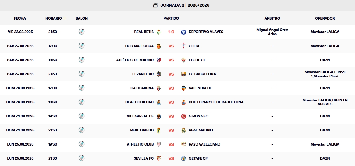 La segunda jornada de LaLiga EA Sports arranca con ganas y, como siempre, trae de todo: partidos de vértigo, reencuentros con estadios llenos y equipos que aún están aterrizando en la competición. Si el estreno ya nos dejó alguna sorpresa, este fin de semana promete no quedarse atrás.