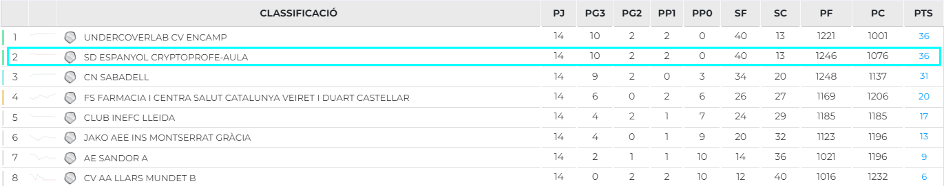 La SD Espanyol de voleibol ganó su encuentro en la visita al UNDERCOVERLAB CV ENCAMP por dos sets a tres (23-25 /26-24 /13-25 /25-18 /9-15) y ya son colíderes de la clasificación. El próximo encuentro es el del inicio de la promoción, que se enfrentarán al CV Salou el 3 de febrero, con la hora por determinar.