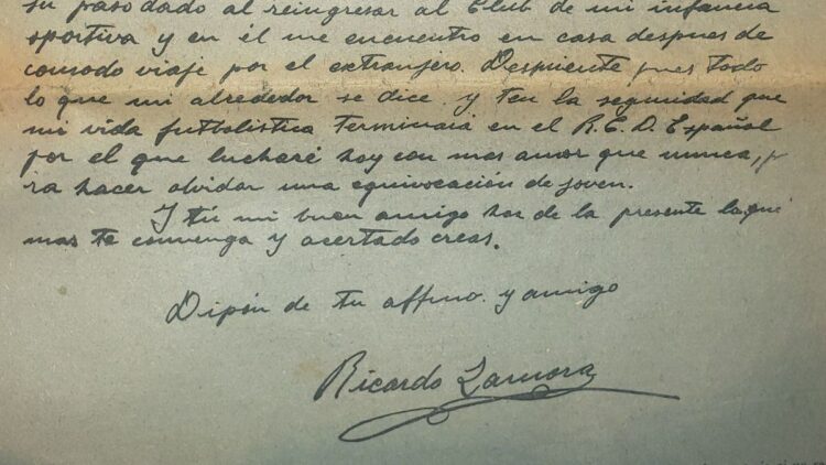 Porque sí, Zamora fue un ídolo blanquiazul, el primer gran crack del fútbol español, y también cometió errores. El más sonado, irse al Barça tras un desencuentro con la directiva españolista. Un movimiento que, años después, él mismo reconoció como una metedura de pata de juventud. “Por el R.C.D. Español lucharé hoy con más amor que nunca para hacer olvidar una equivocación de joven”, escribió de su puño y letra en una carta publicada por la Gaceta Sportiva el 3 de octubre de 1922. Un documento que sacó en su día a la luz nuestro compañero de AS Iván Molero a la luz gracias al periodista y perico Marc Casado, nieto del fundador de la peña blanquiazul de Sant Cugat.