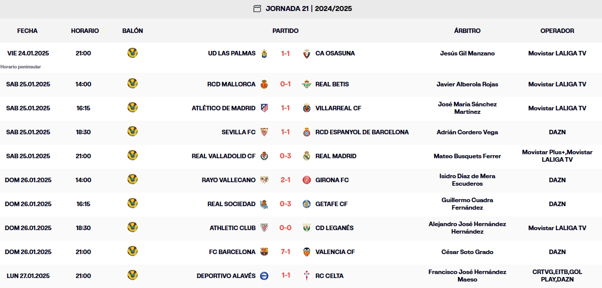 Entre el viernes 24 de enero y el lunes 27 se ha disputado la jornada 21 de LaLiga EA Sports, la última programada íntegramente en el primer mes del año.