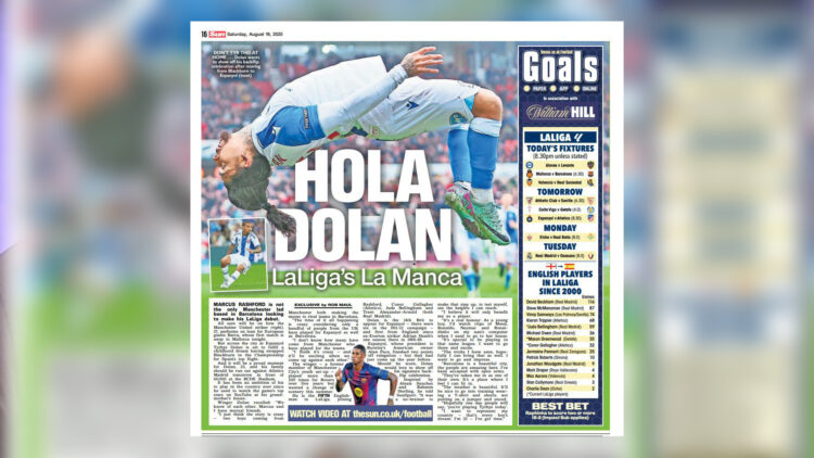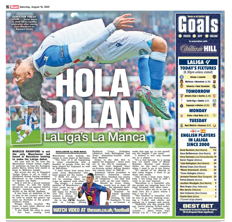 El joven extremo inglés, que debutó oficialmente como perico el pasado domingo contra el Atlético de Madrid, ha llamado la atención del tabloide británico, que dedica una página completa a contar su historia. Bajo el título “Don’t try this at home…” (No intentes esto en casa…), el diario arranca explicando que Dolan quiere estrenar su famosa celebración acrobática lo antes posible. Ya lo avisa él mismo: si marca, habrá voltereta asegurada.