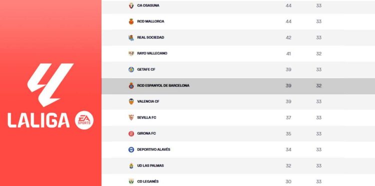 Hoy finaliza la jornada 33 de LaLiga EA Sports, que se ha disputado desde el martes 22 hasta el jueves 24 de abril. El martes 22 de abril se jugaban el Valencia-RCD Espanyol (1-1) y el FC Barcelona-Mallorca (1-0). El conjunto blanquiazul dormía 13º, ocho puntos por sobre del descenso.
