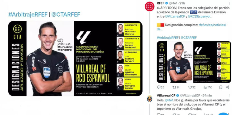 El ambiente en Vila-real está más caldeado que nunca. Los últimos arbitrajes sufridos por el Submarino Amarillo han desatado una oleada de indignación en el seno del club castellonense y entre la afición grogueta, que no han dudado en elevar el tono de sus quejas hacia la RFEF y el Comité Técnico de Árbitros (CTA). El Villarreal se siente perseguido por lo que consideran una acumulación de decisiones arbitrales en su contra, y ha mostrado su malestar más recientemente en lo institucional, con un mensaje claro a través de sus redes sociales tras detectarse un error en la designación arbitral para el encuentro ante el Espanyol, donde el nombre del club fue escrito erróneamente como “Villareal”, incidencia que recoge El Periódico del Mediterráneo.