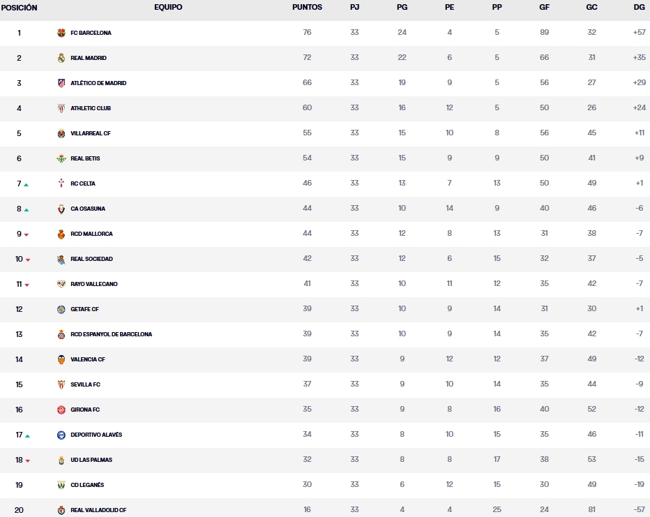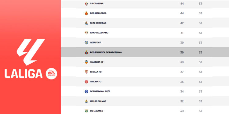 Con la disputa del partido ante el Villarreal, correspondiente a la jornada 26 y que quedó pendiente el pasado 3 de marzo a causa de las condiciones meteorológicas, por fin el Espanyol se pone al día en número de partidos respecto al resto de equipo. Con este resultado, el equipo de Manolo González queda 13º en la tabla, con 39 puntos. Es decir, queda a uno de esos 40 que tradicionalmente marcan la permanencia matemática, a 5 de la 8ª plaza, que da derecho a disputar la Conference League, y siete puntos sobre el descenso con 15 en disputa hasta que acabe el campeonato.