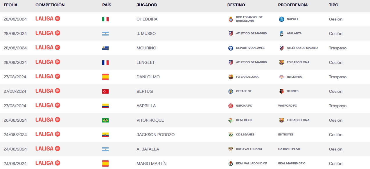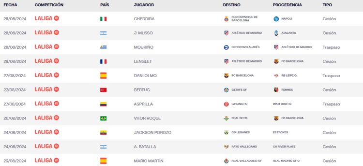 Kembulla, la anterior incorporación, fue inscrita el pasado 22 de agosto. Alex Král y Alejo Veliz, el 16 también de agosto, e Irvin Cardona, el 18, mientras que el lateral izquierdo Carlos Romero lo fue el pasado 26 de julio; dos días antes, el 24 del mismo mes, lo había sido Álvaro Tejero.